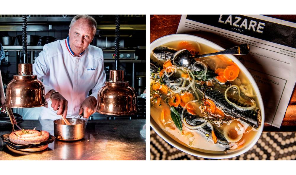 Il a pris un train d'avance. Éric Frechon a été le premier maestro des fourneaux à poser ses valises dans une gare en France. Le chef 3 étoiles de l'Épicure, au Bristol, transite depuis le 9 septembre 2013 à Saint-Lazare. Le Meilleur Ouvrier de France 1993 a renoué avec l'esprit de haute voltige bistrotière qui faisait courir toute la capitale au milieu des années 1990 jusque dans sa Verrière perchée sur les Buttes-Chaumont. Les gourmands se bousculent pour prendre place au Lazare, dans une atmosphère mêlant les contrastes de matières – bois, cuivre, cuir, laiton, tissu... – signée par l'architecte d'intérieur Karine Lewkowicz. Du petit déjeuner au dîner, Éric Frechon, normand pur jus, délivre, sous la houlette de Thierry Colas, une cuisine fêtant la grande tradition hexagonale à la sauce contemporaine : maquereau cuit en terrine, gelée de vin blanc et raifort ; merlan de ligne rôti aux croûtons et pignons de pin, tétragone au xérès ; la « meilleure saucisse purée de Paris » ; épaule d'agneau confite au citron et aux olives, boulgour au jus ; Paris-Deauville.