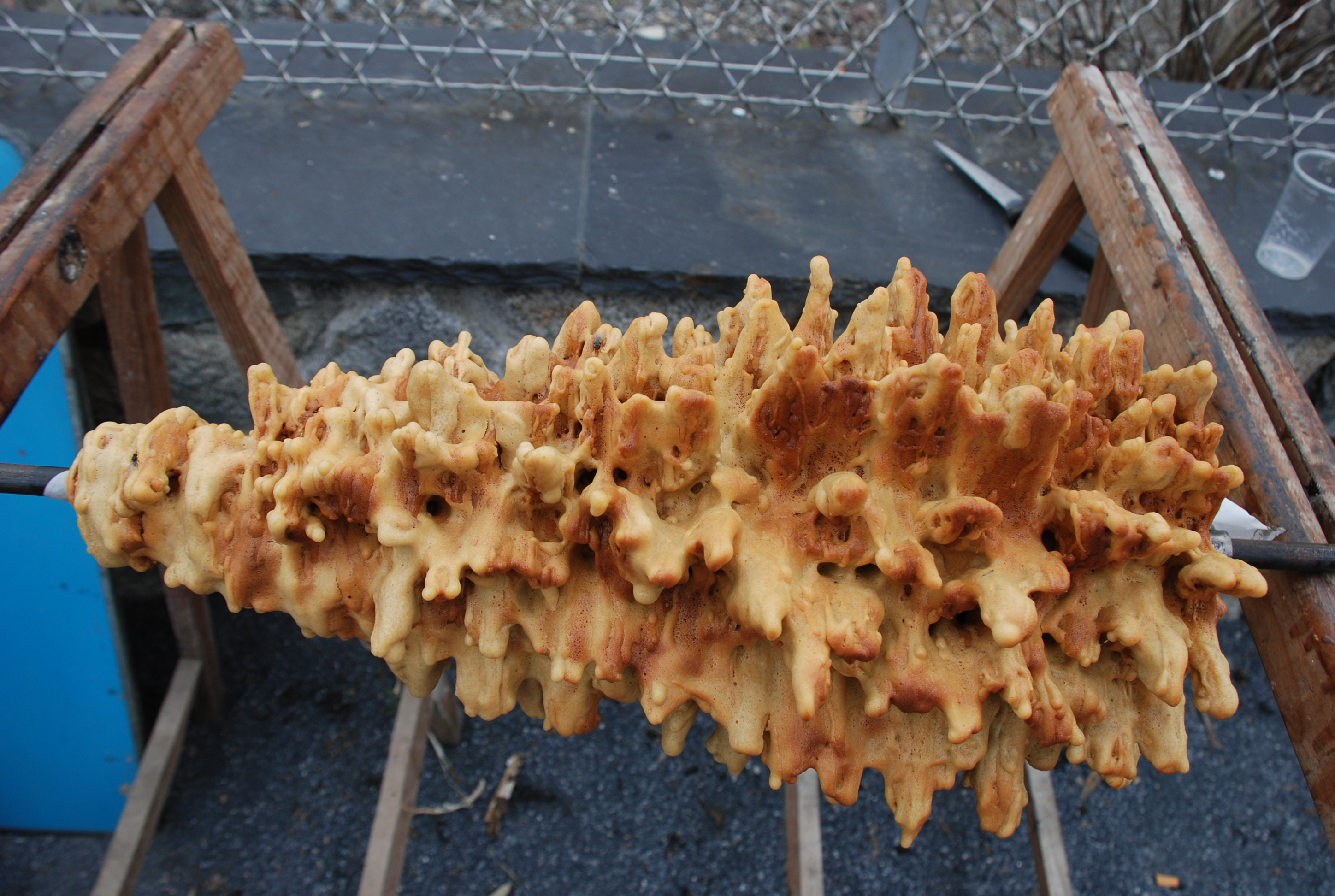 La forme prend lors de la cuisson et on peut voir apparaître des pics arrondis faits par le mouvement de la broche et des flammes.